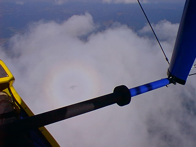 Auf diese Wolkenfetzen in etwa 2000m NN beim Feldberg fällt nicht nur unser Schatten, sondern sie reflektieren das Sonnenlicht in (zwei) kreisrunden Regenbögen rund um den eigentlichen Schatten.