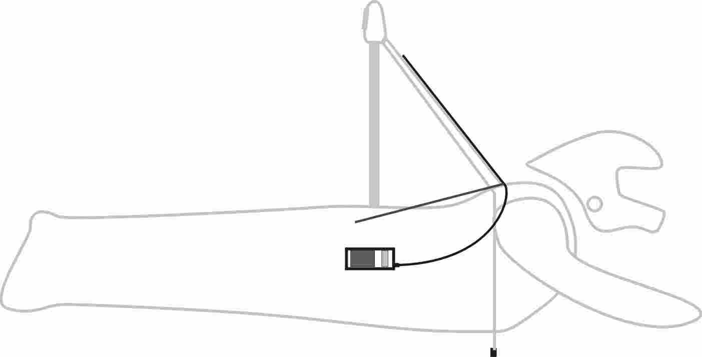 schwarze flexible Strahler führt entweder an der Hauptaufhängung nach oben (Gurtzeuge ohne Schlitten), besser noch am starren Seil der Neigungsverstellung nach oben oder im